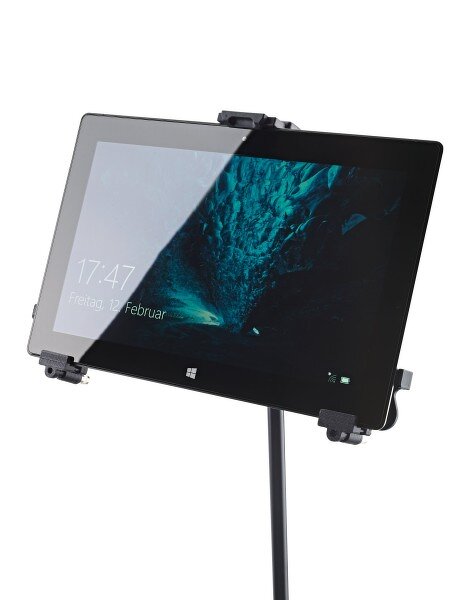 Držák oceníte na pódiu, ve zkušebně i doma. Díky standardnímu 3/8" závitu ho lze snadno a rychle připevnit např. na běžný mikrofonní stojan. Nastavitelná podpůrná ramena umožňují uchycení tabletu o výšce od 128 do 232 mm a šířce od 222 do 334 mm. Podporovaná hloubka je mezi 6 a 11 mm. Je kompatibilní například s modely iPad, iPad Air, iPad Pro, Amazon Fire HDX 8.9, Samsung Galaxy Tab od velikosti 9.7", Google Nexus 9, Asus Transformer nebo Microsoft Surface a Surface Pro.