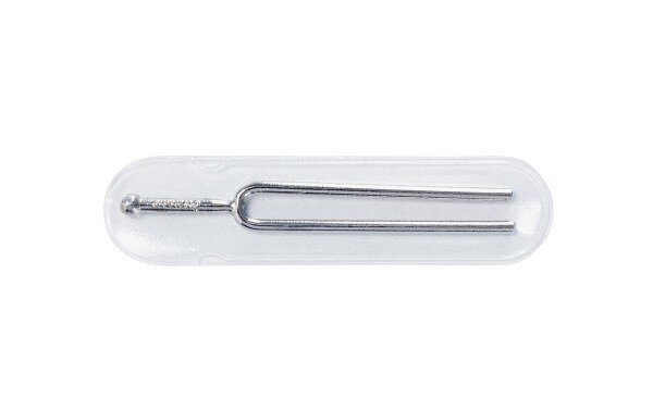 Kulatá ocelová ladička. Vibruje 440krát za sekundu a dosahuje středního tónu A (ladění A 440 Hz).